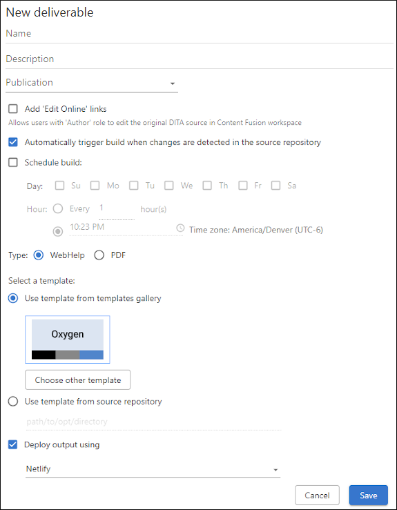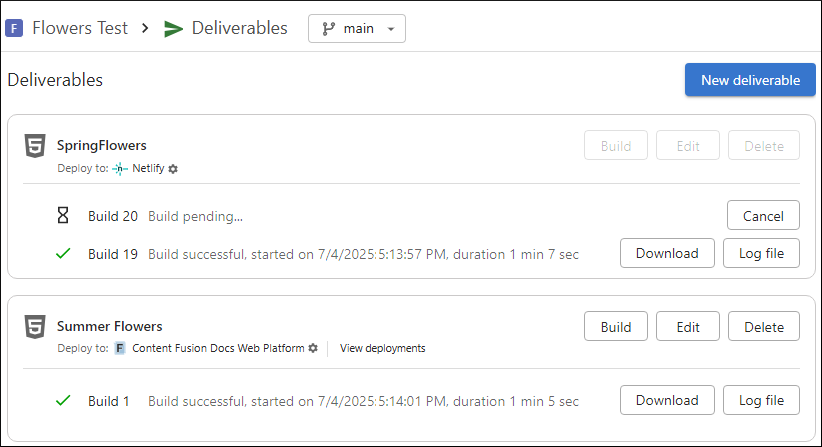 From this page, you can create a new deliverable, build an existing deliverable, view logs, or download the deliverable as a ZIP archive. You can even schedule a periodic build for a deliverable to automate the process.