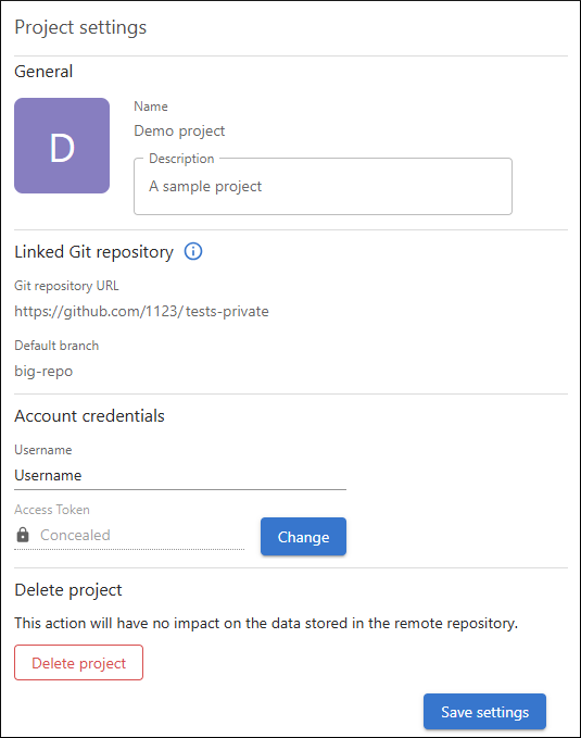 You can edit the Account credentials used to connect to the Git repository, while all the other settings (project name, description, project URL, branch) are read-only and cannot be updated.