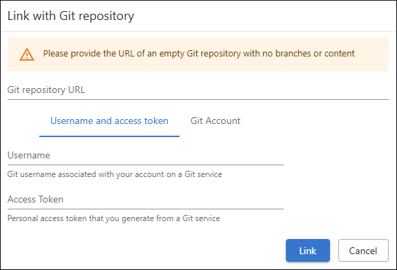 - If the project is created from a template, you can link a Git repository at a later time using the Link Repository button. The Git repository should be empty, with no content or branches.