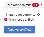If there are conflicts, the badge with the number of incoming commits is highlighted in red. You can click the Resolve conflicts button to open a dialog box where you can choose actions for resolving the conflicts.