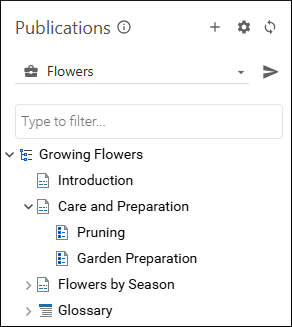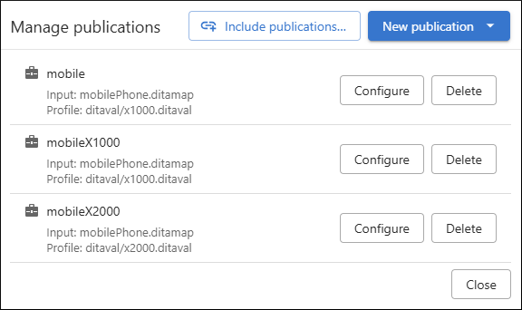 publication:- From existing DITA map - Adds a new publication based on an existing DITA map. In the resulting dialog box, you enter a name for the publication and specify the context DITA map and optionally, a DITAVAL filter file.