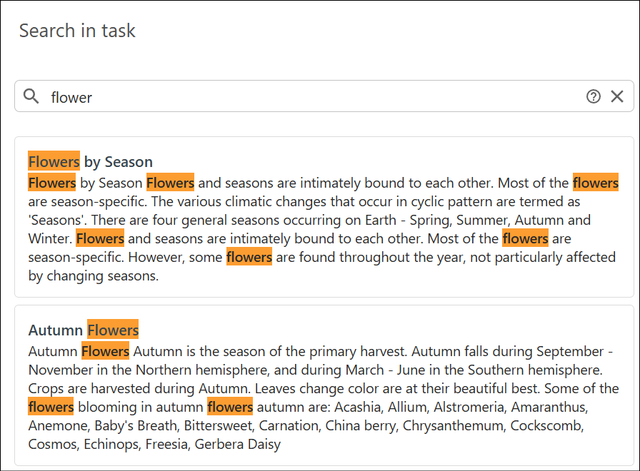 Enter the text you want to search for in the search field at the top of the page. The search looks for matches in the text of all task files. See Advanced Search for advanced options. A short reference is also available in the UI via the help icon next to the search field.