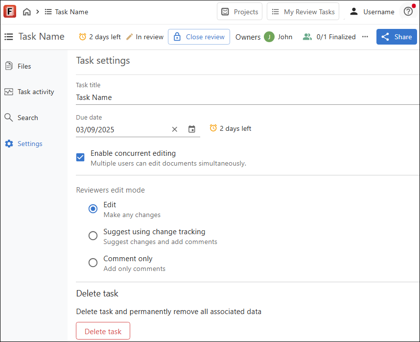 - Edit (default) - Reviewers are allowed to edit documents within the task.