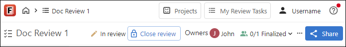 Whenever a review task is open, the upper part of the header stripe remains the same no matter what page you navigate to within the review task, which makes certain navigation options and the breadcrumb available at all times.