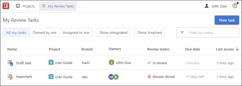 The status of the task is displayed to the right of each task. A task is displayed as In review unless it is closed by a task owner. If a task has been closed, the status is displayed as Review closed.