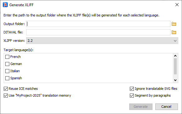 Result: An XLIFF file will be generated in the output folder for each selected language.