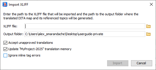 - Accept unapproved translations - Uses translations that are not marked as approved in the XLIFF file being imported.