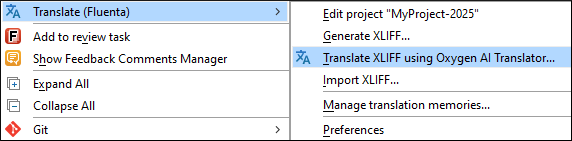 After generating the XLIFF file, you can translate it directly in Oxygen XML using the AI Translator add-on. To access the action to translate XLIFF with the AI Translator, right-click on a DITA map in the Project View or DITA Maps Manager and select . This action is visible only if there is a Fluenta project associated with the selected DITA map. This add-on automates the translation process with AI models and provides advanced translation management features. For more information, see AI Translator Add-on.