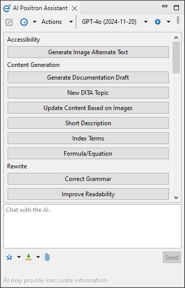 - Preferences - Opens the Oxygen AI Positron preferences page where you can configure the AI Positron service address and provide a Context for the user that the AI will use to create more relevant and personalized responses.