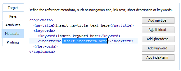 The main section of the dialog box includes the following tabs: Target, Keys, Attributes, Metadata, and Profiling. The availability of the tabs and their functions depend on the selected node. For example, if you invoke the action on a root map, only the Attributes, Metadata, and Profiling tabs are accessible and the Title property can be configured. Also, if you select multiple nodes, only the Profiling tab is available.
