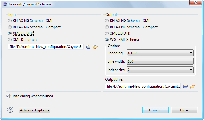 The Generate/Convert Schema tool allows you to convert a DTD or Relax NG (full or compact syntax) schema or a set of XML files to an equivalent XML Schema, DTD or Relax NG (full or compact syntax) schema. Where perfect equivalence is not possible due to limitations of the target language, Oxygen XML Developer Eclipse plugin generates an approximation of the source schema. Oxygen XML Developer Eclipse plugin uses the Trang multiple format converter to perform the actual schema conversions.