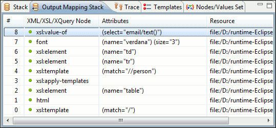 The Output Mapping Stack view displays context data and presents the XSLT templates/XQuery elements that generated specific areas of the output. If the view is not displayed, it can be opened by selecting it from the menu.