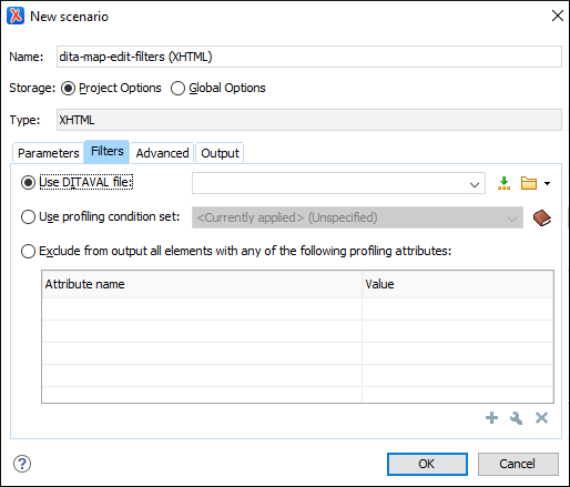 If you already have a DITAVAL file associated with the DITA map, you can specify the file to be used when filtering content. You can specify the path by using the text field, its history drop-down, the Insert Editor Variables button, or the browsing actions in the Browse drop-down list. You can find out more about constructing a DITAVAL file in the DITA Documentation.