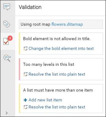 DITA documents are automatically validated as you type and warning messages are displayed in the Validation pane. Many of the DITA validation issues that are detected also include Quick Fix proposals to help you solve the problems.