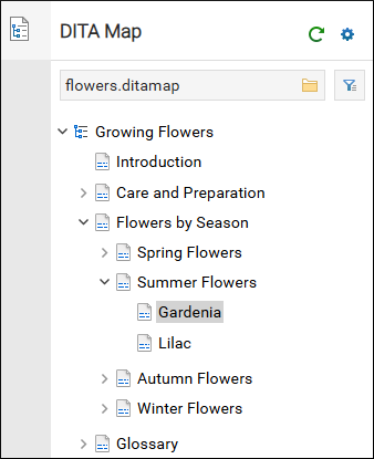 Oxygen XML Web Author includes an expandable DITA Map pane that presents a DITA map as a hierarchical tree. The pane is automatically displayed (collapsed, by default) when you open a DITA map in the editor.