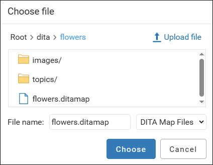 You can use the file type filter drop-down to the right of the File name field to filter the files to be displayed based on resource type (e.g. DITA map files). Once you select a file, click Choose to open it.