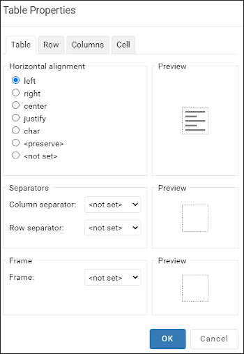 - Horizontal alignment (Available in the Table, Column, and Cell tabs)