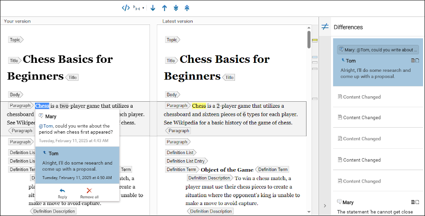 There is an expandable/collapsible Differences view on the far-right side. Its main purpose is to help you understand differences between review comments. When an item is selected in the Differences view, the changed content is highlighted in the editor. If the change corresponds to a review comment, a pop-up box with the comment's conversation thread is displayed below the change in the document. The pop-up box also contains inline actions to reply to the comment or remove the thread. You can also hover over a difference that contains a review comment in the editor to see a pop-up of the comment. To navigate between items in the Differences view, you can use the mouse, the toolbar navigation buttons, or keyboard keys (arrow keys, Tab, Shift+Tab).