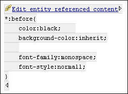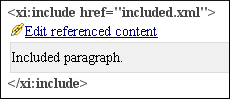 The references to external entities, XInclude, DITA conrefs, and constructs in other vocabularies with displayable referenced content are expanded by default in Author mode and the referenced content is displayed. The referenced resources are loaded and displayed inside the element or entity that references them, but the displayed content cannot be modified directly in the document. You can control this behavior from the Author preferences page. If the Display referenced content option is not selected, the referenced resources are not automatically loaded and displayed, but each reference can be expanded on demand by using the small expansion button located next to each element that contains references.