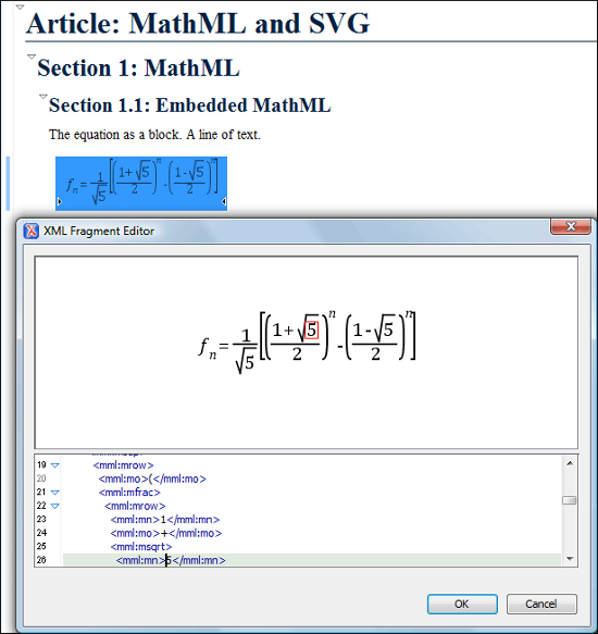 Oxygen XML Author includes a built-in editor for MathML notations. To start the MathML editor, double-click a MathML notation (for embedded notations, you can also select the Edit Equation action from its contextual menu). In the MathML editor, you can edit the mathematical symbols of a MathML notation. To open a MathML file from your current project, select from the contextual menu in the Project view.