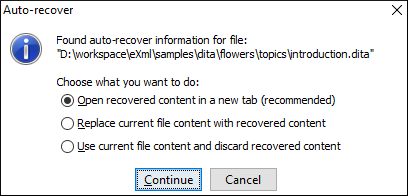 In the event of an application or system crash, once you restart the application, Oxygen XML Author looks for an auto-recover file for each document that is either automatically or manually reopened. If an auto-recover file is found, a dialog box is displayed with options for how to handle the recovered information.