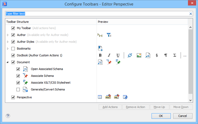 - You can use the filter text box at the top of the dialog box to search for a specific toolbar or action.
