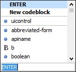 • If the cursor is positioned inside a space-preserved element (for example, a codeblock), the first choice in the Content Completion Assistant is Enter, which will insert a new line in the content of the element, followed by New <Element>.