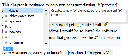 One of the most useful features in Author mode is the Content Completion Assistant. It offers a list of elements, attributes, attribute values, and other options that are valid in the current editing context.