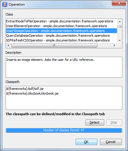 <?xml version="1.0" encoding="UTF-8"?> <project name="project" default="dist"> <target name="dist"> <jar destfile="sdf.jar" basedir="classes"> <fileset dir="classes"> <include name="**/*"/> </fileset> </jar> </target> </project> - Copy the sdf.jar file into your custom framework directory ([OXYGEN_INSTALL_DIR]\frameworks\[CUSTOM_FRAMEWORK_DIR]).