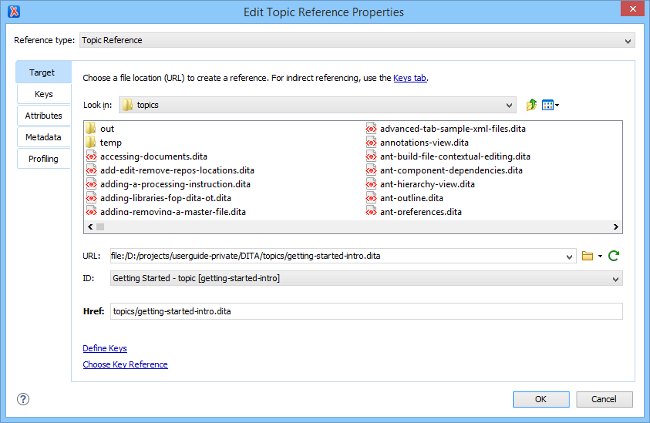 parent node).You can use the Edit Properties dialog box to modify or define attributes, metadata, profiling, or keys in DITA maps or topics. You can also use it to modify the title of root maps.