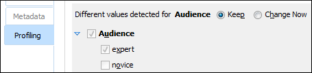 When you modify a selection of values in this tab, the change will also automatically be reflected in the Attributes tab. For more information, see DITA Profiling / Conditional Text.