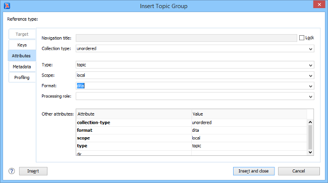 Those actions open the Insert Topic Group dialog box that allows you to easily