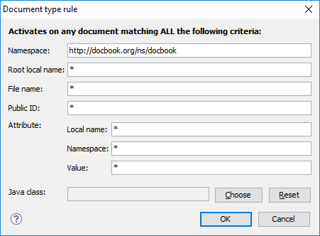 By combining multiple association rules you can instruct Oxygen XML Author to identify the type of a document. Oxygen XML Author identifies the type of a document when the document matches at least one of the association rules. This tab gives you access to a Document type rule dialog box that you can use to create association rules that activate on any document matching all the criteria defined in the dialog box.