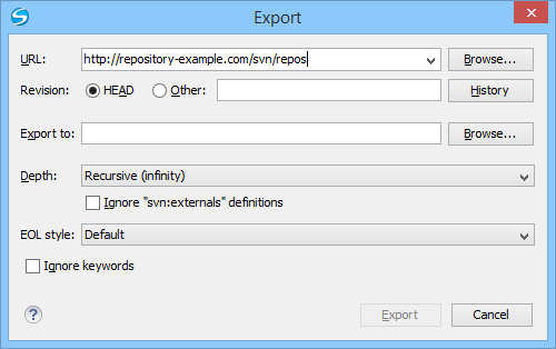 By default, the SVN system only exports the content of the directory specified by the URL, and not the directory itself. Therefore, it is recommended to use the Browse button to select the export location so that the client will automatically append the name of the remote directory to the path of the selected directory.