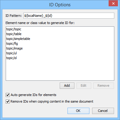 - The elements that will have ID values generated, specified using class attribute values. To customize the list, use the Add, Edit, or Remove buttons.