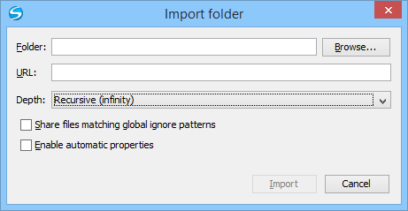 This folder should not be empty or already under version control.Important:By default, the SVN system only imports the content of the specified folder, and not the folder itself. Therefore, it is recommended to use the Browse button to select the local folder so that the client will automatically append the name of it to the specified URL.