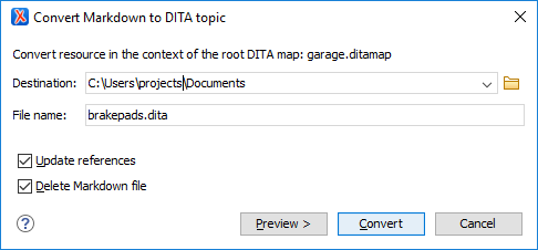 Select this button to perform the conversion. If the Markdown file has format="markdown", it will be converted to a DITA topic. If it has format="mdita", it will be converted to a LightWeight DITA topic.