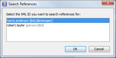 Selecting an ID that you use for search or refactor operations differs between the Text and Author modes. In the Text mode, you position the cursor inside the declaration or reference of an ID. In the Author mode, Oxygen XML Author collects all the IDs by analyzing each element from the path to the root. If more IDs are available, you are prompted to choose one of them.