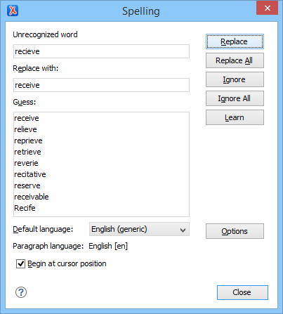 @langor@xml:langattribute for any particular section and Oxygen XML Author will automatically instruct the spell checker engine to apply the appropriate language dictionary for that section. - Begin at cursor position