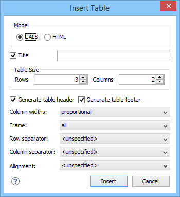 When you click Insert, a CALS table is inserted into your document at the current cursor position.