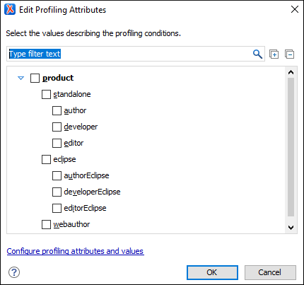 to the left of the profiling attribute name.The attributes and values that appear in the dialog box are determined as follows:- If you have defined profiling attribute values for the DITA document type in the Attributes and Condition Sets preferences page, those values are displayed in the dialog box.