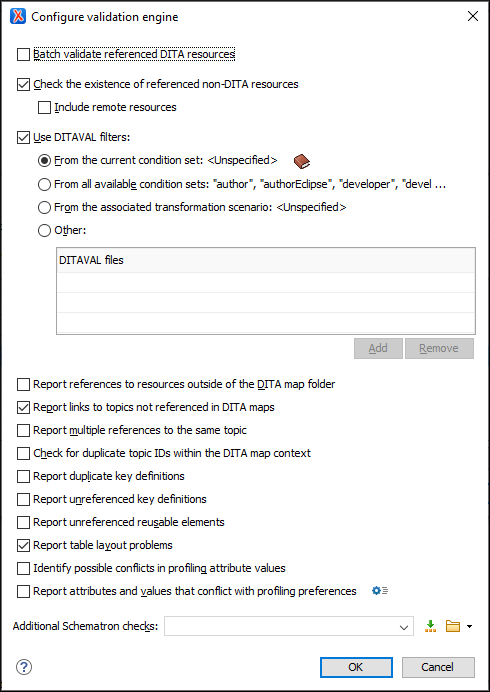 - If the checkbox is left unchecked (default setting), the DITA files will be validated using the rules defined in the DTD or XML Schema declared in the document.
