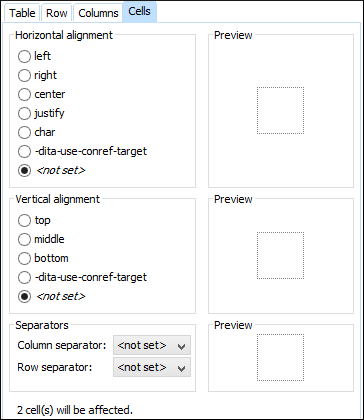 Figure 1. Table Properties Dialog Box with Cell Tab Selected (DITA CALS Table Model)
