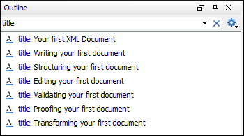 You can configure the Outline view to determine what is shown, such as element names, attributes, and comments. Certain choices may work better for particular document types. You can also filter the Outline view to show only elements with a certain name.
