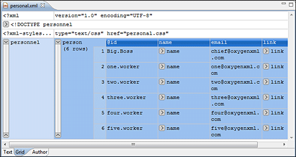 For more information about working with XML documents in Grid mode and all of the details about its features, see the Editing XML Documents in Grid Mode section.