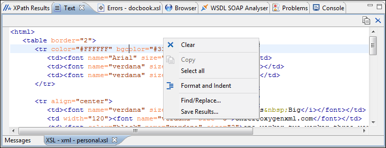 The Oxygen XML Author Eclipse plugin Text view is automatically displayed in the views pane of the Eclipse window to display text output from XSLT transformations, FO processor info, warnings, and error messages. It contains a tab for each file with text results displayed in the view.