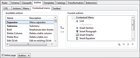 In the Contextual menu subtab you configure what framework-specific action the Content Completion Assistant proposes. The subtab is divided into two sections: Available actions and Current actions.