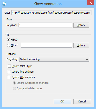 - Select the encoding to be used when the annotation is computed. For each line of text, the SVN Client looks through the history of the file to be annotated see when it was last modified, and by whom. It is required that it is in the form of a text file. Therefore, encoding is needed to properly decode and read the file content. By default, the encoding of the operating system is used.