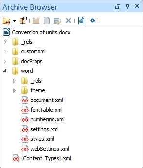 Oxygen XML Developer includes a helper view called the Archive Browser that allows you to view the contents and structure of an archive, and it offers a variety of toolbar and contextual menu actions. If the view is not displayed, it can be opened by selecting it from the menu.