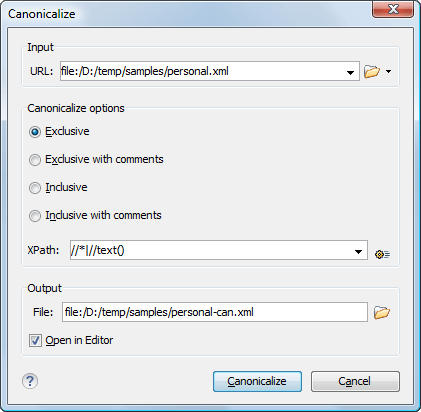 - Input URL - Available if the Canonicalize action was selected from the Tools menu. It allows you to specify the location of the input file.